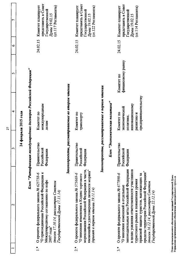 "О КАЛЕНДАРЕ РАССМОТРЕНИЯ ВОПРОСОВ ГОСУДАРСТВЕННОЙ ДУМОЙ С 17 ПО 27 ФЕВРАЛЯ 2015 ГОДА"