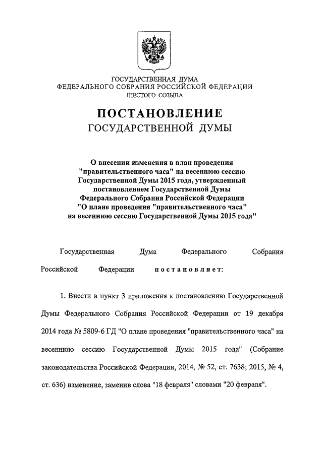 "О ВНЕСЕНИИ ИЗМЕНЕНИЯ В ПЛАН ПРОВЕДЕНИЯ "ПРАВИТЕЛЬСТВЕННОГО ЧАСА" НА ВЕСЕННЮЮ СЕССИЮ ГОСУДАРСТВЕННОЙ ДУМЫ 2015 ГОДА, УТВЕРЖДЕННЫЙ ПОСТАНОВЛЕНИЕМ ГОСУДАРСТВЕННОЙ ДУМЫ ФЕДЕРАЛЬНОГО СОБРАНИЯ РОССИЙСКОЙ ФЕДЕРАЦИИ "О ПЛАНЕ ПРОВЕДЕНИЯ "ПРАВИТЕЛЬСТВЕННОГО ЧАСА" НА ВЕСЕННЮЮ СЕССИЮ ГОСУДАРСТВЕННОЙ ДУМЫ 2015 ГОДА"