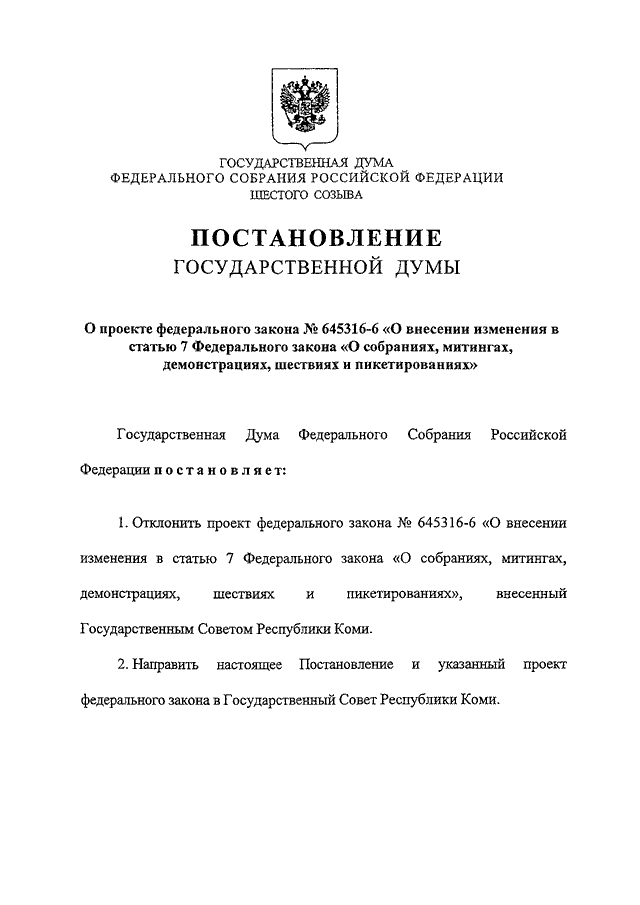 "О ПРОЕКТЕ ФЕДЕРАЛЬНОГО ЗАКОНА N 645316-6 "О ВНЕСЕНИИ ИЗМЕНЕНИЯ В СТАТЬЮ 7 ФЕДЕРАЛЬНОГО ЗАКОНА "О СОБРАНИЯХ, МИТИНГАХ, ДЕМОНСТРАЦИЯХ, ШЕСТВИЯХ И ПИКЕТИРОВАНИЯХ"