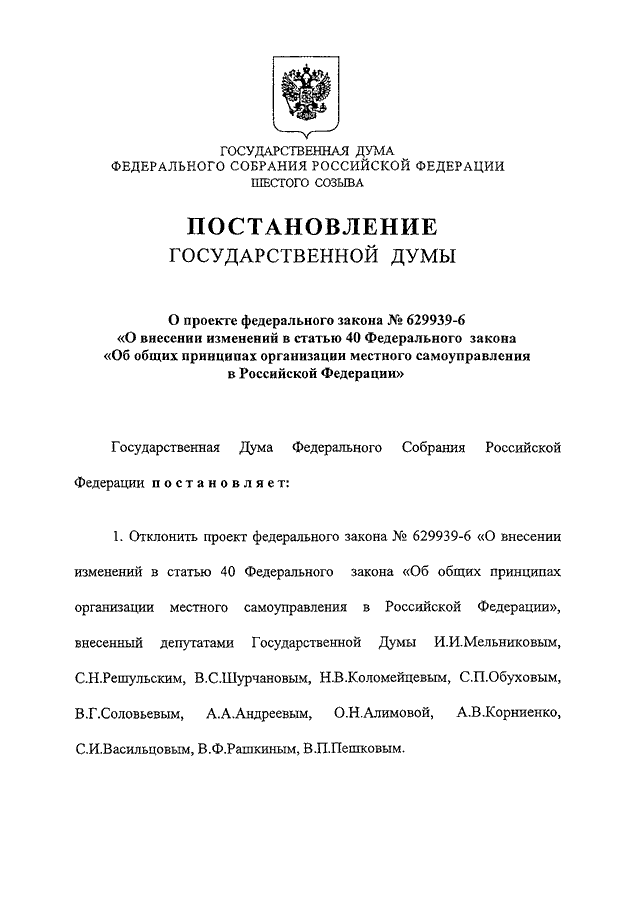 "О ПРОЕКТЕ ФЕДЕРАЛЬНОГО ЗАКОНА N 629939-6 "О ВНЕСЕНИИ ИЗМЕНЕНИЙ В СТАТЬЮ 40 ФЕДЕРАЛЬНОГО ЗАКОНА "ОБ ОБЩИХ ПРИНЦИПАХ ОРГАНИЗАЦИИ МЕСТНОГО САМОУПРАВЛЕНИЯ В РОССИЙСКОЙ ФЕДЕРАЦИИ"