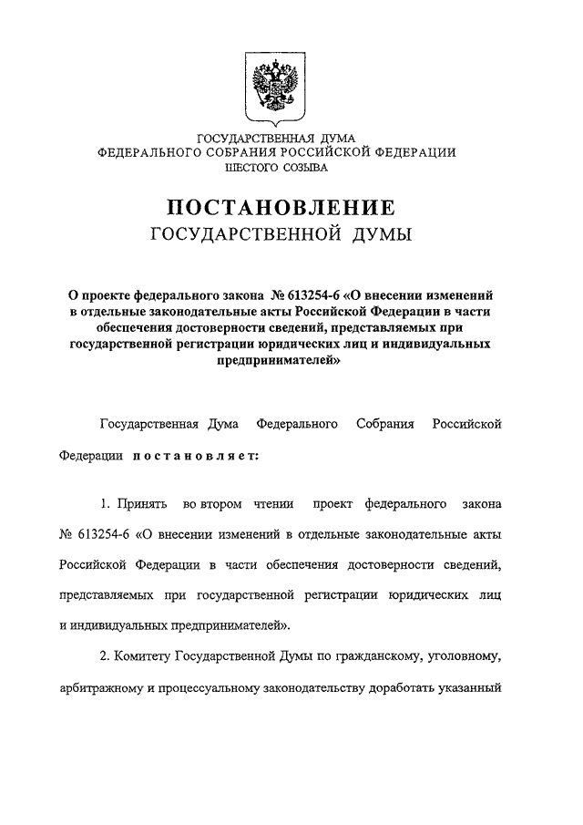 "О ПРОЕКТЕ ФЕДЕРАЛЬНОГО ЗАКОНА N 613254-6 "О ВНЕСЕНИИ ИЗМЕНЕНИЙ В ОТДЕЛЬНЫЕ ЗАКОНОДАТЕЛЬНЫЕ АКТЫ РОССИЙСКОЙ ФЕДЕРАЦИИ В ЧАСТИ ОБЕСПЕЧЕНИЯ ДОСТОВЕРНОСТИ СВЕДЕНИЙ, ПРЕДСТАВЛЯЕМЫХ ПРИ ГОСУДАРСТВЕННОЙ РЕГИСТРАЦИИ ЮРИДИЧЕСКИХ ЛИЦ И ИНДИВИДУАЛЬНЫХ ПРЕДПРИНИМАТЕЛЕЙ"