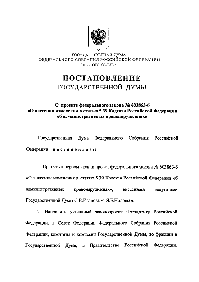 "О ПРОЕКТЕ ФЕДЕРАЛЬНОГО ЗАКОНА N 603863-6 "О ВНЕСЕНИИ ИЗМЕНЕНИЯ В СТАТЬЮ 5.39 КОДЕКСА РОССИЙСКОЙ ФЕДЕРАЦИИ ОБ АДМИНИСТРАТИВНЫХ ПРАВОНАРУШЕНИЯХ"