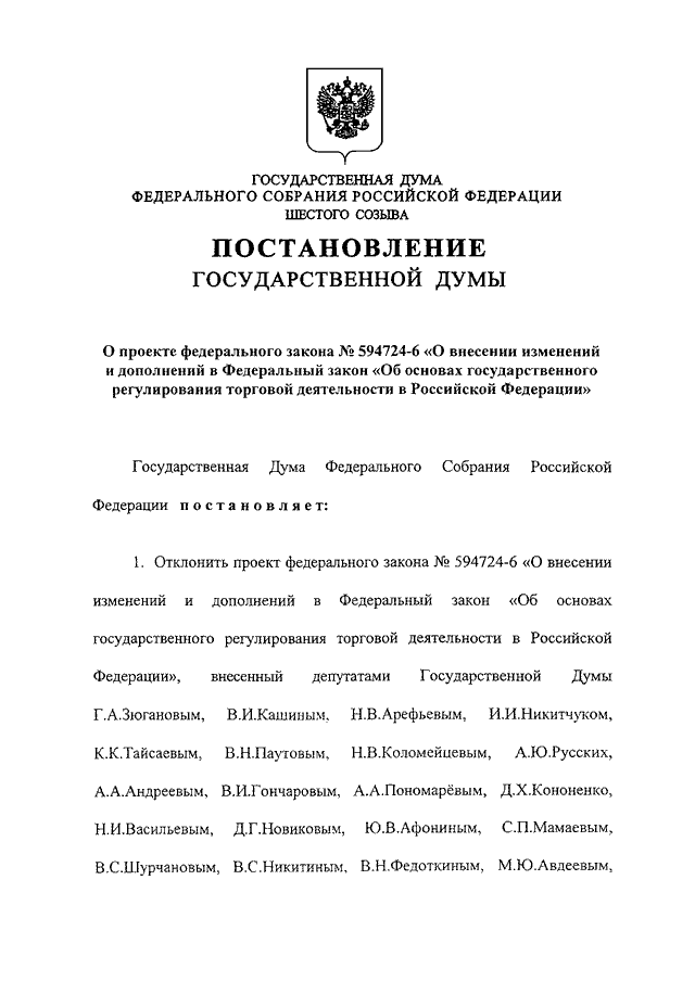 "О ПРОЕКТЕ ФЕДЕРАЛЬНОГО ЗАКОНА N 594724-6 "О ВНЕСЕНИИ ИЗМЕНЕНИЙ И ДОПОЛНЕНИЙ В ФЕДЕРАЛЬНЫЙ ЗАКОН "ОБ ОСНОВАХ ГОСУДАРСТВЕННОГО РЕГУЛИРОВАНИЯ ТОРГОВОЙ ДЕЯТЕЛЬНОСТИ В РОССИЙСКОЙ ФЕДЕРАЦИИ"