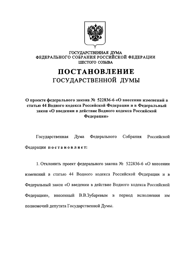 "О ПРОЕКТЕ ФЕДЕРАЛЬНОГО ЗАКОНА N 522836-6 "О ВНЕСЕНИИ ИЗМЕНЕНИЙ В СТАТЬЮ 44 ВОДНОГО КОДЕКСА РОССИЙСКОЙ ФЕДЕРАЦИИ И В ФЕДЕРАЛЬНЫЙ ЗАКОН "О ВВЕДЕНИИ В ДЕЙСТВИЕ ВОДНОГО КОДЕКСА РОССИЙСКОЙ ФЕДЕРАЦИИ"