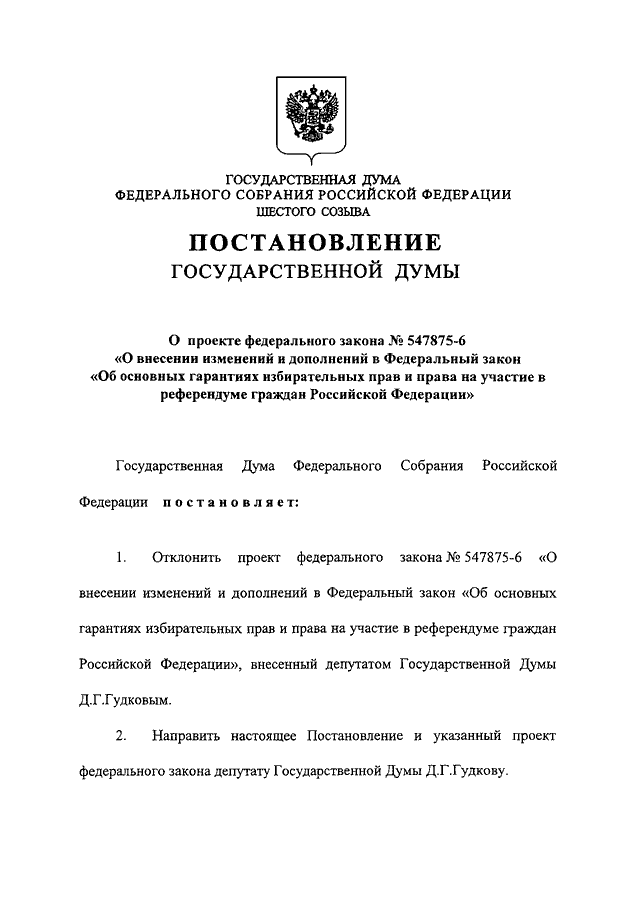 "О ПРОЕКТЕ ФЕДЕРАЛЬНОГО ЗАКОНА N 547875-6 "О ВНЕСЕНИИ ИЗМЕНЕНИЙ И ДОПОЛНЕНИЙ В ФЕДЕРАЛЬНЫЙ ЗАКОН "ОБ ОСНОВНЫХ ГАРАНТИЯХ ИЗБИРАТЕЛЬНЫХ ПРАВ И ПРАВА НА УЧАСТИЕ В РЕФЕРЕНДУМЕ ГРАЖДАН РОССИЙСКОЙ ФЕДЕРАЦИИ"