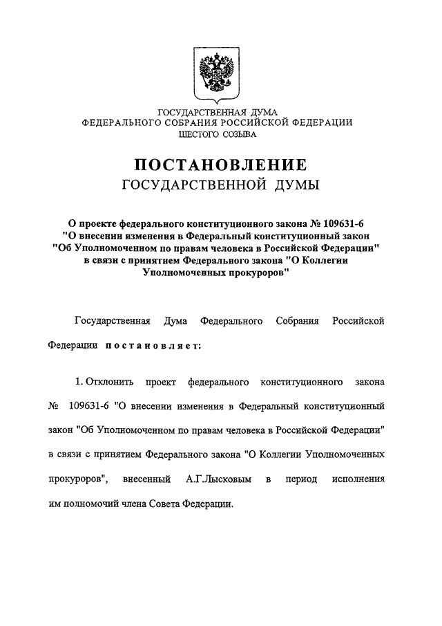 "О ПРОЕКТЕ ФЕДЕРАЛЬНОГО КОНСТИТУЦИОННОГО ЗАКОНА N 109631-6 "О ВНЕСЕНИИ ИЗМЕНЕНИЯ В ФЕДЕРАЛЬНЫЙ КОНСТИТУЦИОННЫЙ ЗАКОН "ОБ УПОЛНОМОЧЕННОМ ПО ПРАВАМ ЧЕЛОВЕКА В РОССИЙСКОЙ ФЕДЕРАЦИИ" В СВЯЗИ С ПРИНЯТИЕМ ФЕДЕРАЛЬНОГО ЗАКОНА "О КОЛЛЕГИИ УПОЛНОМОЧЕННЫХ ПРОКУРОРОВ"