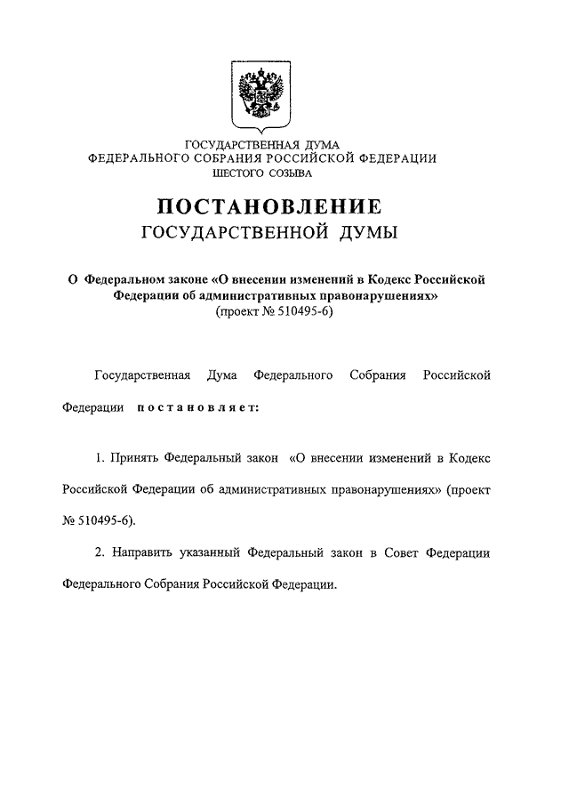 "О ФЕДЕРАЛЬНОМ ЗАКОНЕ "О ВНЕСЕНИИ ИЗМЕНЕНИЙ В КОДЕКС РОССИЙСКОЙ ФЕДЕРАЦИИ ОБ АДМИНИСТРАТИВНЫХ ПРАВОНАРУШЕНИЯХ" (ПРОЕКТ N 510495-6)"