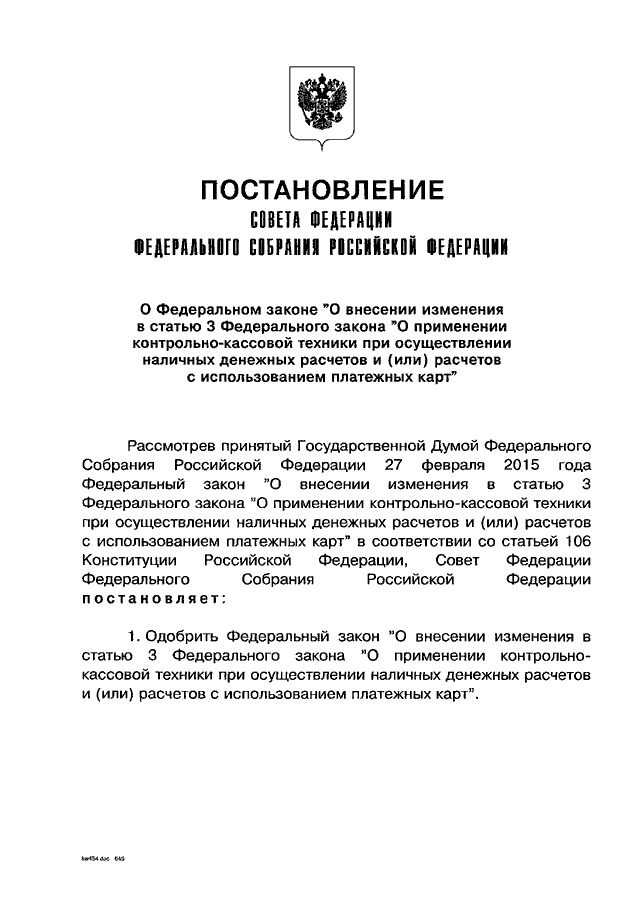 ФЕДЕРАЛЬНОГО ЗАКОНА "О ПРИМЕНЕНИИ КОНТРОЛЬНО - КАССОВОЙ ТЕХНИКИ