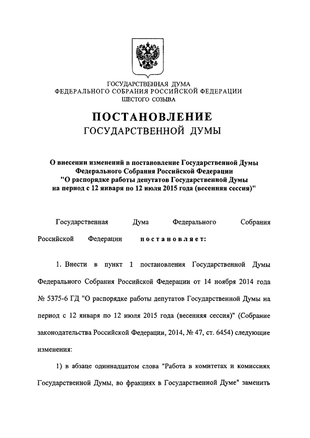"О ВНЕСЕНИИ ИЗМЕНЕНИЙ В ПОСТАНОВЛЕНИЕ ГОСУДАРСТВЕННОЙ ДУМЫ