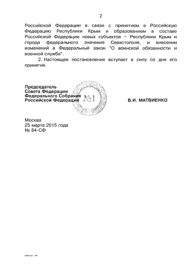 ПОСТАНОВЛЕНИЕ СФ ФС РФ от 25.03.2015 N 84-СФ