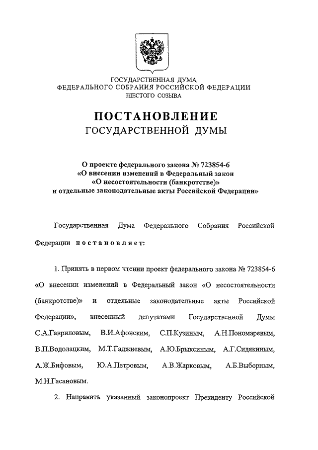 "О ПРОЕКТЕ ФЕДЕРАЛЬНОГО ЗАКОНА N 723854-6 "О ВНЕСЕНИИ ИЗМЕНЕНИЙ В ФЕДЕРАЛЬНЫЙ ЗАКОН "О НЕСОСТОЯТЕЛЬНОСТИ (БАНКРОТСТВЕ)" И ОТДЕЛЬНЫЕ ЗАКОНОДАТЕЛЬНЫЕ АКТЫ РОССИЙСКОЙ ФЕДЕРАЦИИ"