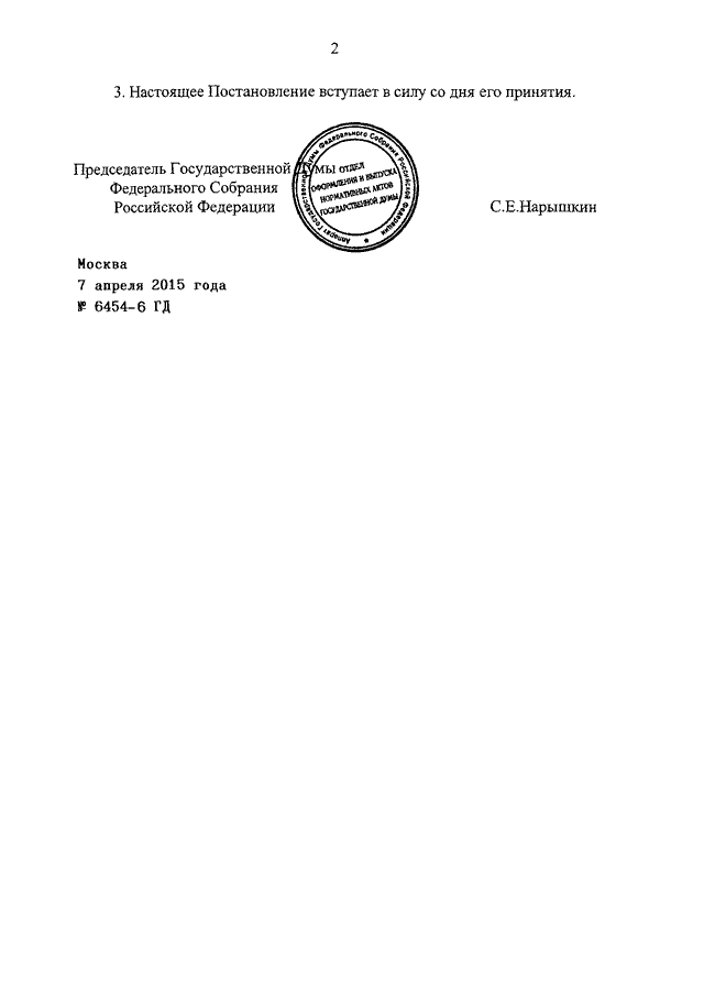 ПОСТАНОВЛЕНИЕ ГД ФС РФ от 07.04.2015 N 6454-6 ГД