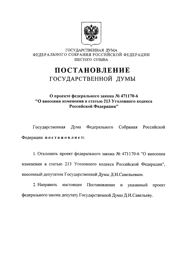 "О ПРОЕКТЕ ФЕДЕРАЛЬНОГО ЗАКОНА N 471170-6 "О ВНЕСЕНИИ ИЗМЕНЕНИЯ В СТАТЬЮ 213 УГОЛОВНОГО КОДЕКСА РОССИЙСКОЙ ФЕДЕРАЦИИ"