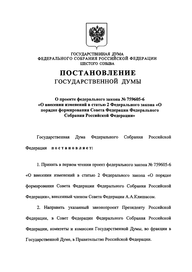 "О ПРОЕКТЕ ФЕДЕРАЛЬНОГО ЗАКОНА N 759605-6 "О ВНЕСЕНИИ ИЗМЕНЕНИЙ В СТАТЬЮ 2 ФЕДЕРАЛЬНОГО ЗАКОНА "О ПОРЯДКЕ ФОРМИРОВАНИЯ СОВЕТА ФЕДЕРАЦИИ ФЕДЕРАЛЬНОГО СОБРАНИЯ РОССИЙСКОЙ ФЕДЕРАЦИИ"