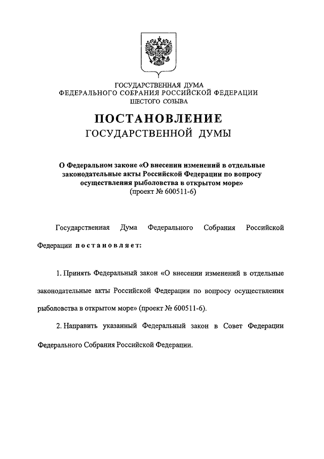 "О ФЕДЕРАЛЬНОМ ЗАКОНЕ "О ВНЕСЕНИИ ИЗМЕНЕНИЙ В ОТДЕЛЬНЫЕ ЗАКОНОДАТЕЛЬНЫЕ АКТЫ РОССИЙСКОЙ ФЕДЕРАЦИИ ПО ВОПРОСУ ОСУЩЕСТВЛЕНИЯ РЫБОЛОВСТВА В ОТКРЫТОМ МОРЕ" (ПРОЕКТ N 600511-6)"