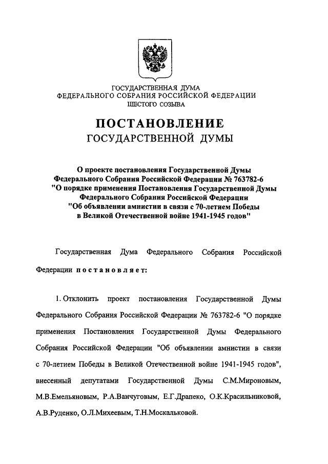 "О ПРОЕКТЕ ПОСТАНОВЛЕНИЯ ГОСУДАРСТВЕННОЙ ДУМЫ ФЕДЕРАЛЬНОГО СОБРАНИЯ РОССИЙСКОЙ ФЕДЕРАЦИИ N 763782-6 "О ПОРЯДКЕ ПРИМЕНЕНИЯ ПОСТАНОВЛЕНИЯ ГОСУДАРСТВЕННОЙ ДУМЫ ФЕДЕРАЛЬНОГО СОБРАНИЯ РОССИЙСКОЙ ФЕДЕРАЦИИ "ОБ ОБЪЯВЛЕНИИ АМНИСТИИ В СВЯЗИ С 70-ЛЕТИЕМ ПОБЕДЫ В ВЕЛИКОЙ ОТЕЧЕСТВЕННОЙ ВОЙНЕ 1941-1945 ГОДОВ"