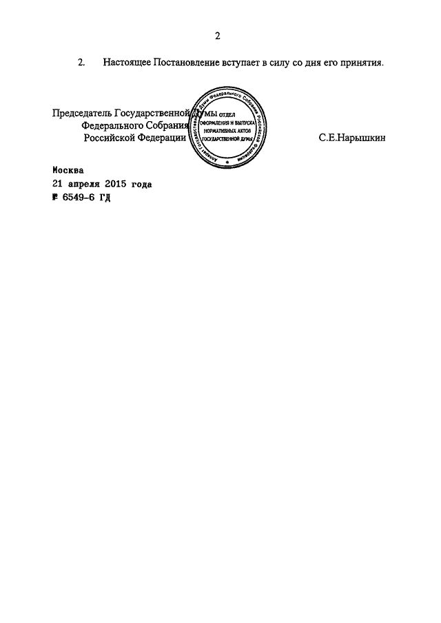 ПОСТАНОВЛЕНИЕ ГД ФС РФ от 21.04.2015 N 6549-6 ГД