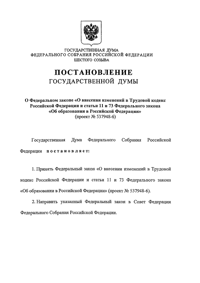 "О ФЕДЕРАЛЬНОМ ЗАКОНЕ "О ВНЕСЕНИИ ИЗМЕНЕНИЙ В ТРУДОВОЙ КОДЕКС РОССИЙСКОЙ ФЕДЕРАЦИИ И СТАТЬИ 11 И 73 ФЕДЕРАЛЬНОГО ЗАКОНА "ОБ ОБРАЗОВАНИИ В РОССИЙСКОЙ ФЕДЕРАЦИИ" (ПРОЕКТ N 537948-6)"