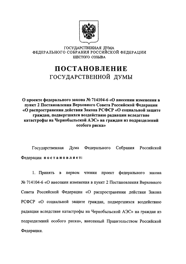 "О ПРОЕКТЕ ФЕДЕРАЛЬНОГО ЗАКОНА N 714104-6 "О ВНЕСЕНИИ ИЗМЕНЕНИЯ В