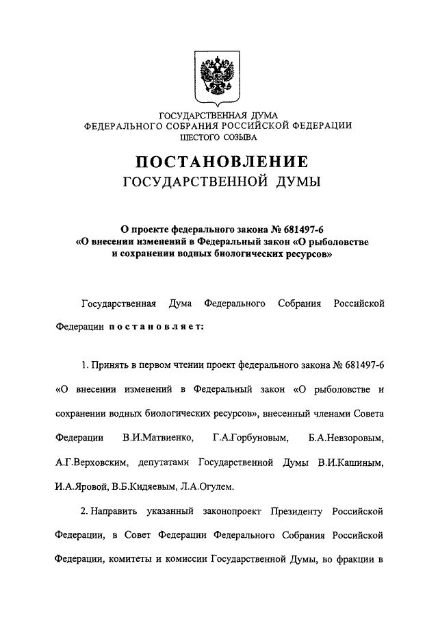 "О ПРОЕКТЕ ФЕДЕРАЛЬНОГО ЗАКОНА N 681497-6 "О ВНЕСЕНИИ ИЗМЕНЕНИЙ В ФЕДЕРАЛЬНЫЙ ЗАКОН "О РЫБОЛОВСТВЕ И СОХРАНЕНИИ ВОДНЫХ БИОЛОГИЧЕСКИХ РЕСУРСОВ"