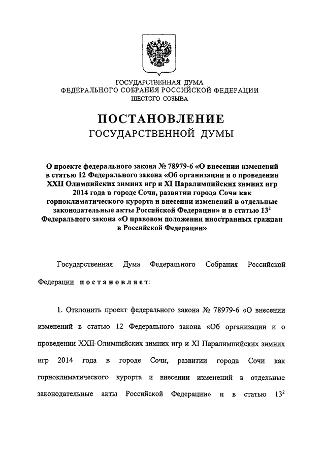 "О ПРОЕКТЕ ФЕДЕРАЛЬНОГО ЗАКОНА N 78979-6 "О ВНЕСЕНИИ ИЗМЕНЕНИЙ В