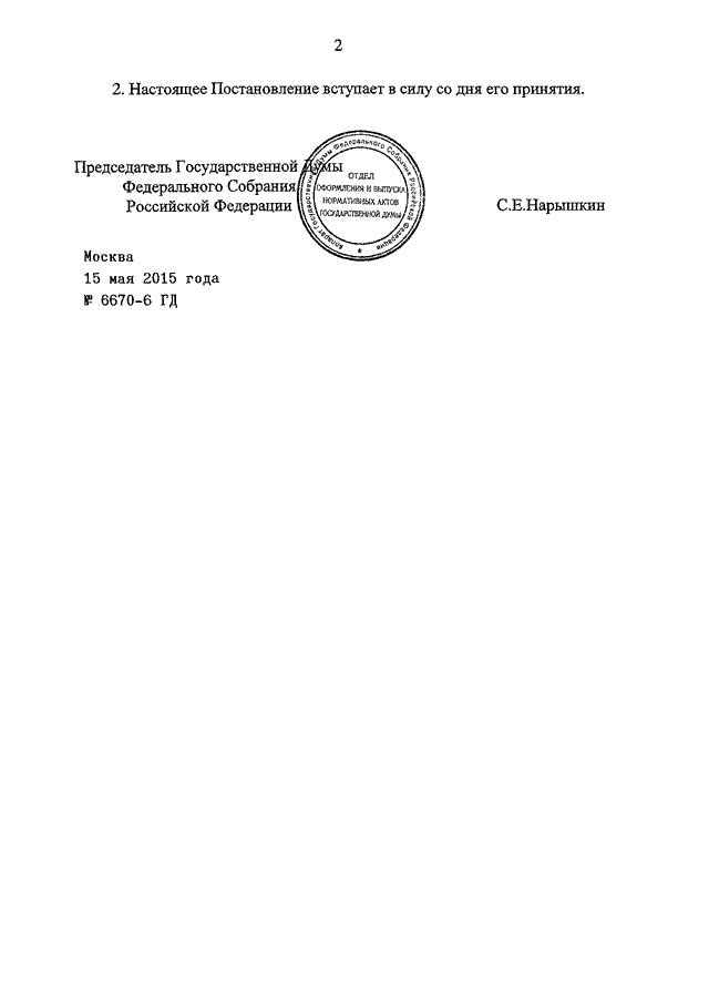 ПОСТАНОВЛЕНИЕ ГД ФС РФ от 15.05.2015 N 6670-6 ГД