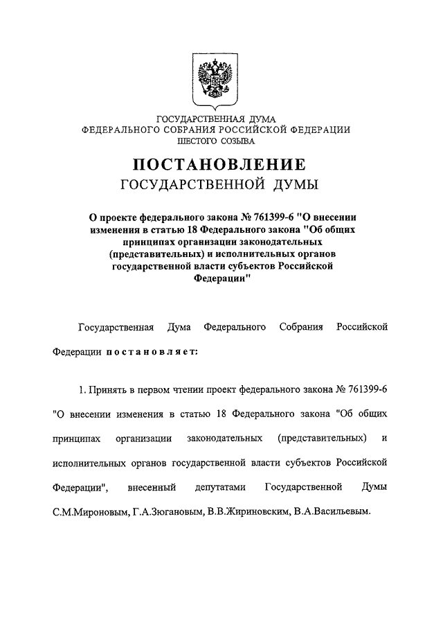 "О ПРОЕКТЕ ФЕДЕРАЛЬНОГО ЗАКОНА N 761399-6 "О ВНЕСЕНИИ ИЗМЕНЕНИЯ В СТАТЬЮ 18 ФЕДЕРАЛЬНОГО ЗАКОНА "ОБ ОБЩИХ ПРИНЦИПАХ ОРГАНИЗАЦИИ ЗАКОНОДАТЕЛЬНЫХ (ПРЕДСТАВИТЕЛЬНЫХ) И ИСПОЛНИТЕЛЬНЫХ ОРГАНОВ ГОСУДАРСТВЕННОЙ ВЛАСТИ СУБЪЕКТОВ РОССИЙСКОЙ ФЕДЕРАЦИИ"