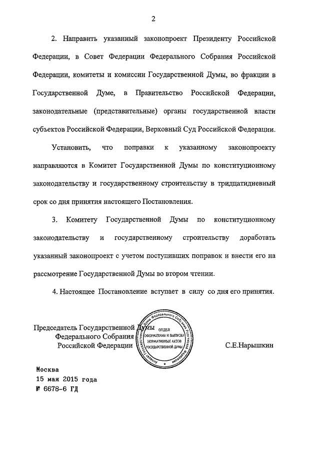 ПОСТАНОВЛЕНИЕ ГД ФС РФ от 15.05.2015 N 6678-6 ГД