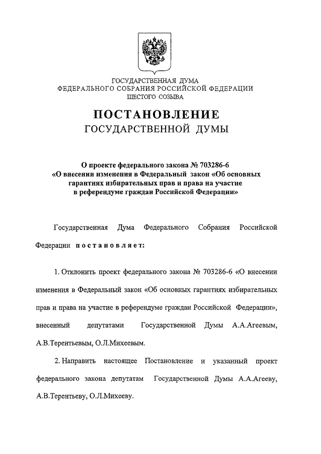 "О ПРОЕКТЕ ФЕДЕРАЛЬНОГО ЗАКОНА N 703286-6 "О ВНЕСЕНИИ ИЗМЕНЕНИЯ В ФЕДЕРАЛЬНЫЙ ЗАКОН "ОБ ОСНОВНЫХ ГАРАНТИЯХ ИЗБИРАТЕЛЬНЫХ ПРАВ И ПРАВА НА УЧАСТИЕ В РЕФЕРЕНДУМЕ ГРАЖДАН РОССИЙСКОЙ ФЕДЕРАЦИИ"
