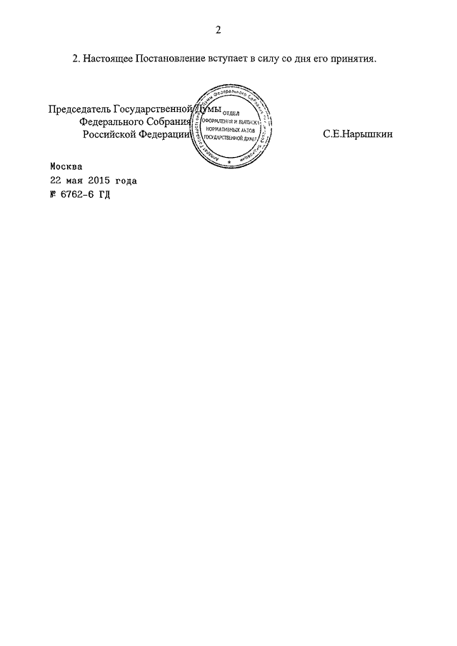 ПОСТАНОВЛЕНИЕ ГД ФС РФ от 22.05.2015 N 6762-6 ГД