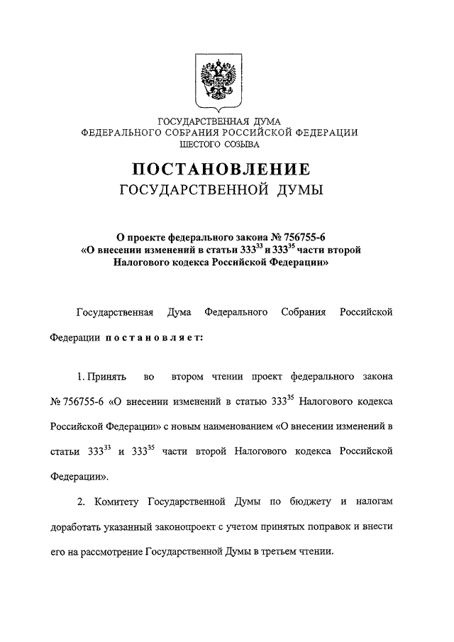 "О ПРОЕКТЕ ФЕДЕРАЛЬНОГО ЗАКОНА N 756755-6 "О ВНЕСЕНИИ ИЗМЕНЕНИЙ В СТАТЬИ 333.33 И 333.35 ЧАСТИ ВТОРОЙ НАЛОГОВОГО КОДЕКСА РОССИЙСКОЙ ФЕДЕРАЦИИ"