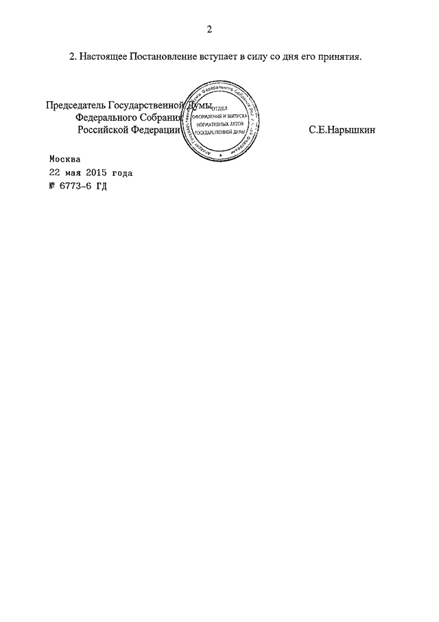 ПОСТАНОВЛЕНИЕ ГД ФС РФ от 22.05.2015 N 6773-6 ГД