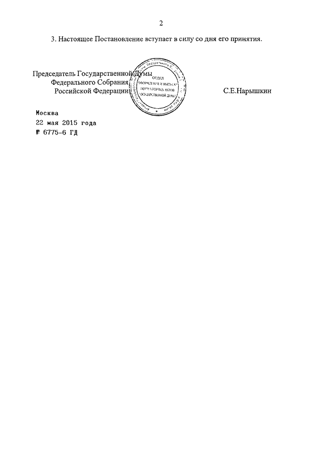 ПОСТАНОВЛЕНИЕ ГД ФС РФ от 22.05.2015 N 6775-6 ГД