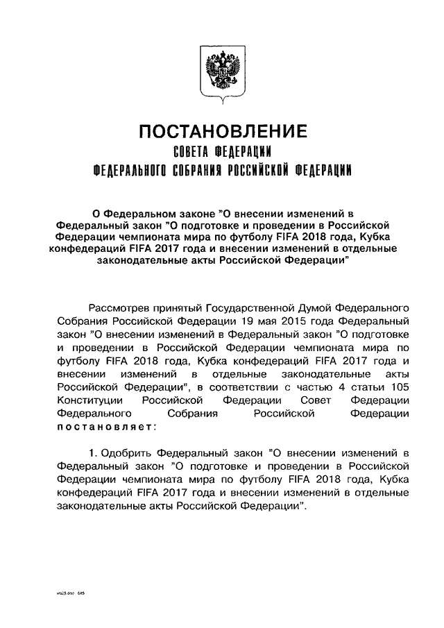 "О ФЕДЕРАЛЬНОМ ЗАКОНЕ "О ВНЕСЕНИИ ИЗМЕНЕНИЙ В ФЕДЕРАЛЬНЫЙ ЗАКОН "О ПОДГОТОВКЕ И ПРОВЕДЕНИИ В РОССИЙСКОЙ ФЕДЕРАЦИИ ЧЕМПИОНАТА МИРА ПО ФУТБОЛУ FIFA 2018 ГОДА, КУБКА КОНФЕДЕРАЦИЙ FIFA 2017 ГОДА И ВНЕСЕНИИ ИЗМЕНЕНИЙ В ОТДЕЛЬНЫЕ ЗАКОНОДАТЕЛЬНЫЕ АКТЫ РОССИЙСКОЙ ФЕДЕРАЦИИ"