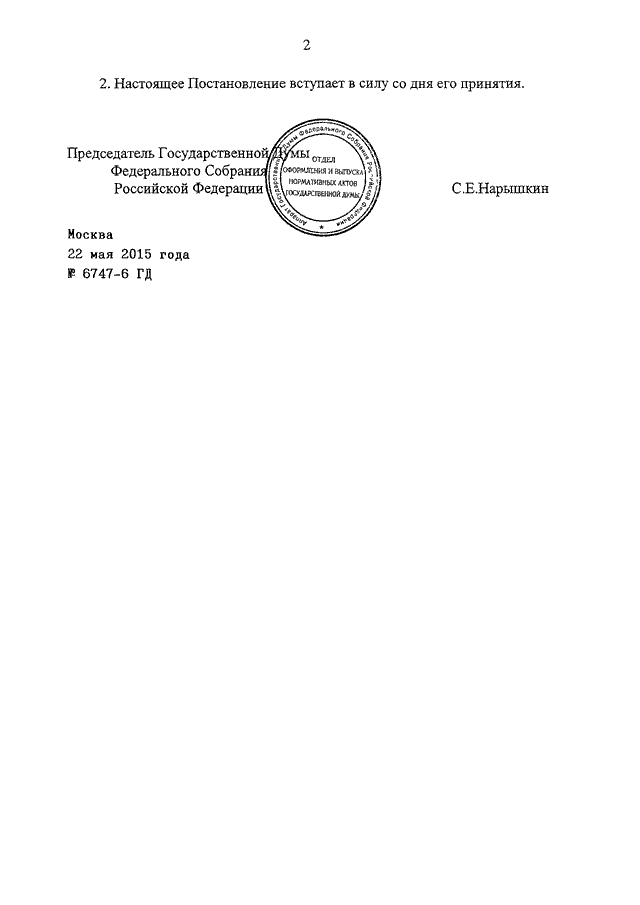 ПОСТАНОВЛЕНИЕ ГД ФС РФ от 22.05.2015 N 6747-6 ГД