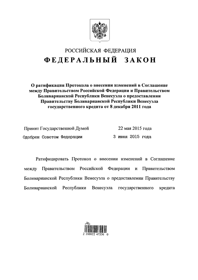 "О РАТИФИКАЦИИ ПРОТОКОЛА О ВНЕСЕНИИ ИЗМЕНЕНИЙ В СОГЛАШЕНИЕ МЕЖДУ ПРАВИТЕЛЬСТВОМ РОССИЙСКОЙ ФЕДЕРАЦИИ И ПРАВИТЕЛЬСТВОМ БОЛИВАРИАНСКОЙ РЕСПУБЛИКИ ВЕНЕСУЭЛА О ПРЕДОСТАВЛЕНИИ ПРАВИТЕЛЬСТВУ БОЛИВАРИАНСКОЙ РЕСПУБЛИКИ ВЕНЕСУЭЛА ГОСУДАРСТВЕННОГО КРЕДИТА ОТ 8 ДЕКАБРЯ 2011 ГОДА"