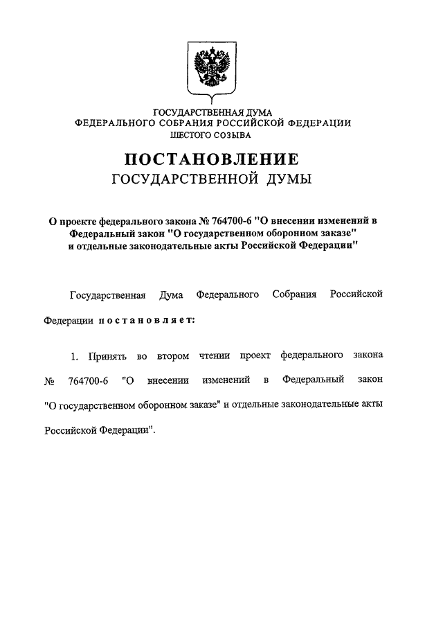 "О ПРОЕКТЕ ФЕДЕРАЛЬНОГО ЗАКОНА N 764700-6 "О ВНЕСЕНИИ ИЗМЕНЕНИЙ В ФЕДЕРАЛЬНЫЙ ЗАКОН "О ГОСУДАРСТВЕННОМ ОБОРОННОМ ЗАКАЗЕ" И ОТДЕЛЬНЫЕ ЗАКОНОДАТЕЛЬНЫЕ АКТЫ РОССИЙСКОЙ ФЕДЕРАЦИИ"
