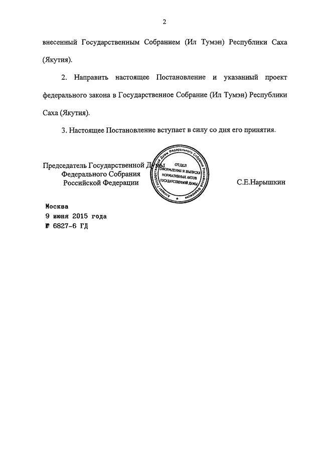 ПОСТАНОВЛЕНИЕ ГД ФС РФ от 09.06.2015 N 6827-6 ГД