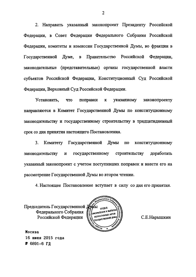 ПОСТАНОВЛЕНИЕ ГД ФС РФ от 16.06.2015 N 6891-6 ГД