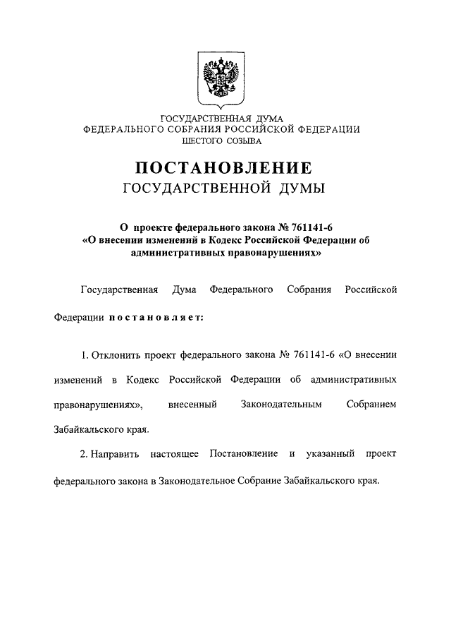 "О ПРОЕКТЕ ФЕДЕРАЛЬНОГО ЗАКОНА N 761141-6 "О ВНЕСЕНИИ ИЗМЕНЕНИЙ В КОДЕКС РОССИЙСКОЙ ФЕДЕРАЦИИ ОБ АДМИНИСТРАТИВНЫХ ПРАВОНАРУШЕНИЯХ"
