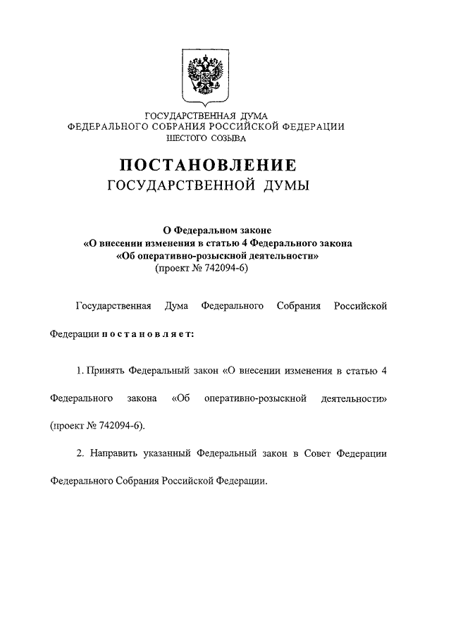"О ФЕДЕРАЛЬНОМ ЗАКОНЕ "О ВНЕСЕНИИ ИЗМЕНЕНИЯ В СТАТЬЮ 4 ФЕДЕРАЛЬНОГО ЗАКОНА "ОБ ОПЕРАТИВНО - РОЗЫСКНОЙ ДЕЯТЕЛЬНОСТИ" (ПРОЕКТ N 742094-6)"