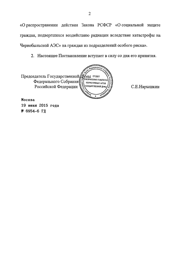 ПОСТАНОВЛЕНИЕ ГД ФС РФ от 19.06.2015 N 6954-6 ГД