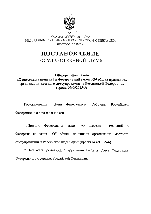 "О ФЕДЕРАЛЬНОМ ЗАКОНЕ "О ВНЕСЕНИИ ИЗМЕНЕНИЙ В ФЕДЕРАЛЬНЫЙ ЗАКОН "ОБ ОБЩИХ ПРИНЦИПАХ ОРГАНИЗАЦИИ МЕСТНОГО САМОУПРАВЛЕНИЯ В РОССИЙСКОЙ ФЕДЕРАЦИИ" (ПРОЕКТ N 692025-6)"