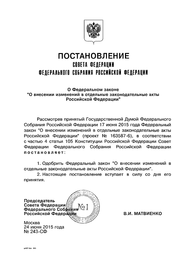 ПОСТАНОВЛЕНИЕ СФ ФС РФ от 24.06.2015 N 243-СФ