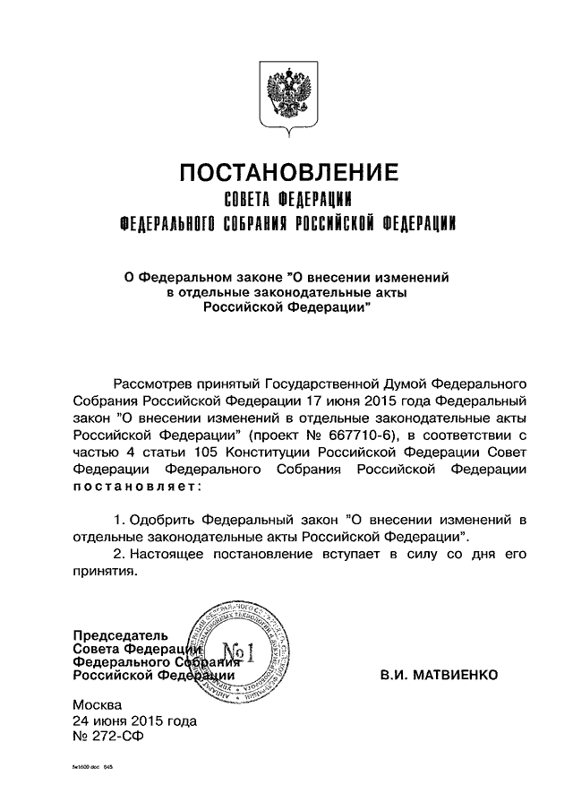 ПОСТАНОВЛЕНИЕ СФ ФС РФ от 24.06.2015 N 272-СФ