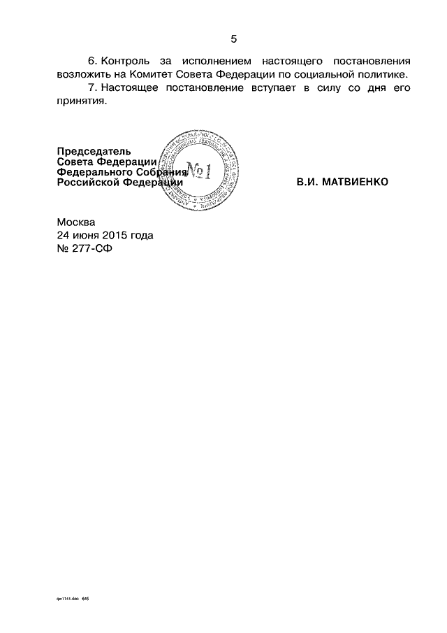 ПОСТАНОВЛЕНИЕ СФ ФС РФ от 24.06.2015 N 277-СФ