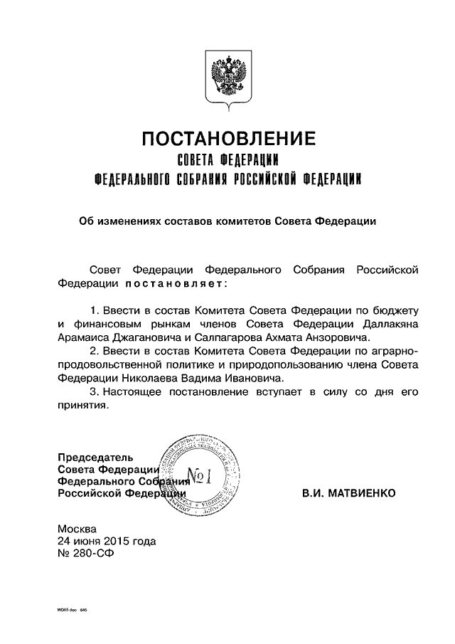 ПОСТАНОВЛЕНИЕ СФ ФС РФ от 24.06.2015 N 280-СФ