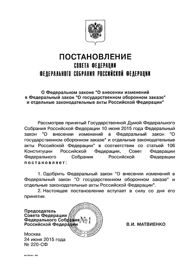 ПОСТАНОВЛЕНИЕ СФ ФС РФ от 24.06.2015 N 220-СФ