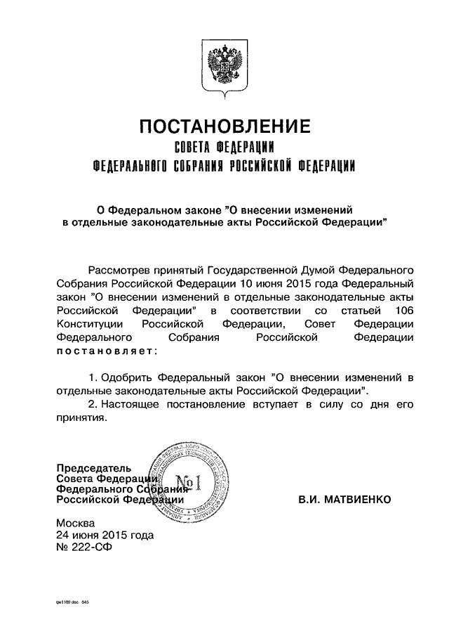 ПОСТАНОВЛЕНИЕ СФ ФС РФ от 24.06.2015 N 222-СФ