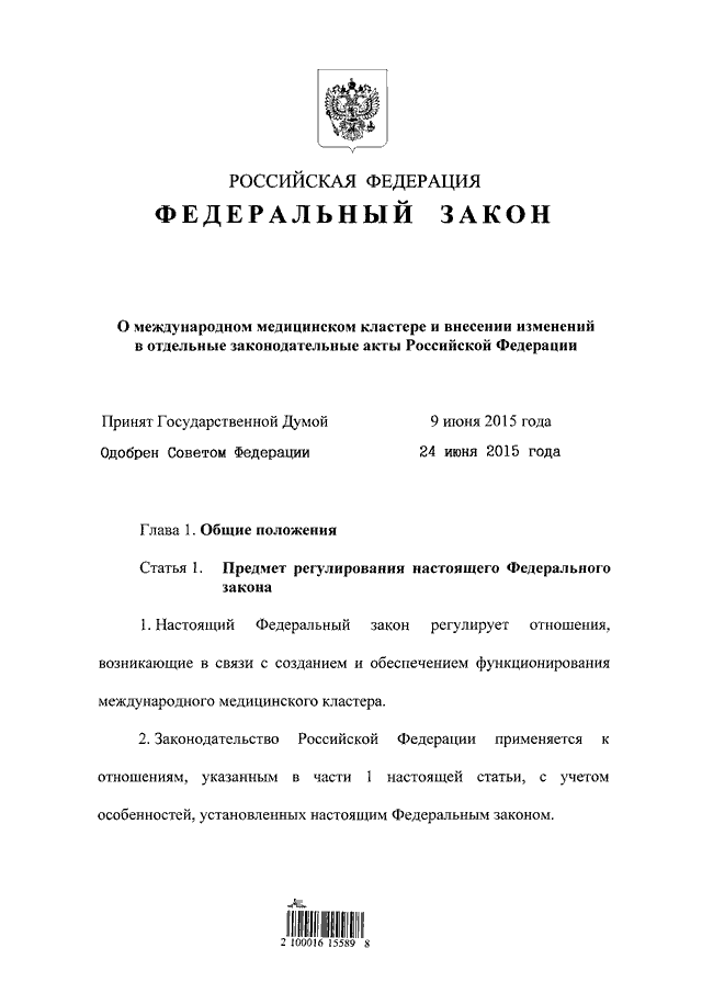 "О МЕЖДУНАРОДНОМ МЕДИЦИНСКОМ КЛАСТЕРЕ И ВНЕСЕНИИ ИЗМЕНЕНИЙ В ОТДЕЛЬНЫЕ ЗАКОНОДАТЕЛЬНЫЕ АКТЫ РОССИЙСКОЙ ФЕДЕРАЦИИ"